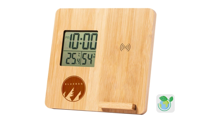 Art. AP833210 Stazione meteorologica in bambù con supporto per il telefono e caricatore veloce wireless incorporato (10W). Funzioni: sveglia, temperatura e umidità. Inclusa batteria a bottone e cavo di ricarica USB.