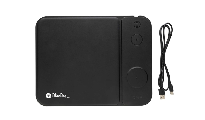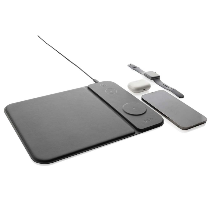 Art. X309-03 Tappetino mouse con caricatore wireless 3 in 1 realizzato in ABS e alluminio riciclato RCS. Dotato di un caricatore wireless magnetico da 15W e di un caricatore wireless aggiuntivo da 5W adatto ai jack delle cuffie o ad altri piccoli dispositivi ricaricabili wireless e di un caricatore wireless da 2,5W. Include un cavo in TPE riciclato da 120 cm certificato RCS. Confezionato in scatola.