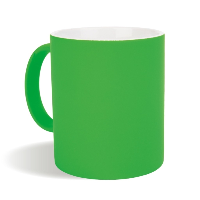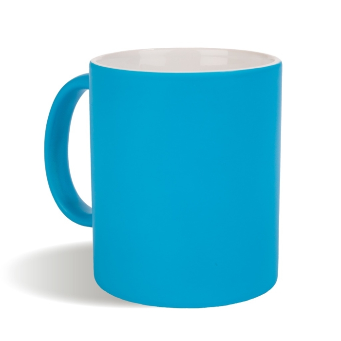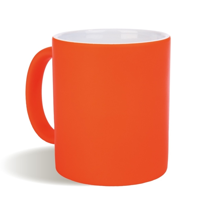 Art. PB20144 Tazze fluo personalizzabili. Realizzata in ceramica di grado A, esterno in colori fluo e interno bianco, con un trattamento specifico per la stampa in sublimazione. È possibile personalizzare la tazza con stampa sublimatica per immagini a più colori o con incisione laser per loghi dettagliati.