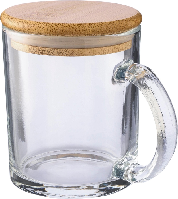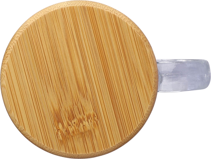 Art. GV2282302 Tazza in vetro riciclato, realizzata a base di sodio e calcio, coperchio in bambù che può essere utilizzato come sottobicchiere, confezionata singolarmente in una scatola in cartone avana.