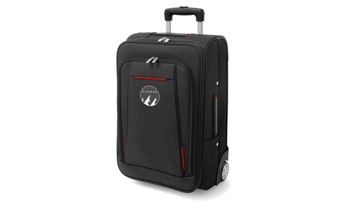 Art. GM03226-STR Trolley da viaggio in 600D e EVA, con parte anteriore semi rigida e interno foderato. Etichetta identificativa nella parte posteriore e maniglia in alluminio, estensibile con molla.