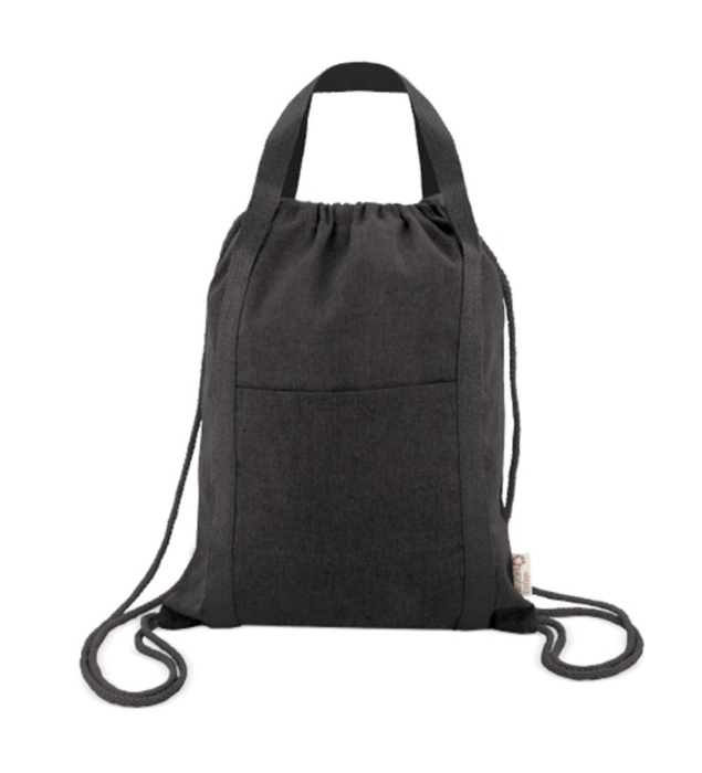 Art. CF21428 Zainetti 2in1 con manico per trasporto a mano. Include una tasca esterna. Realizzato in cotone riciclato, etichetta laterale.