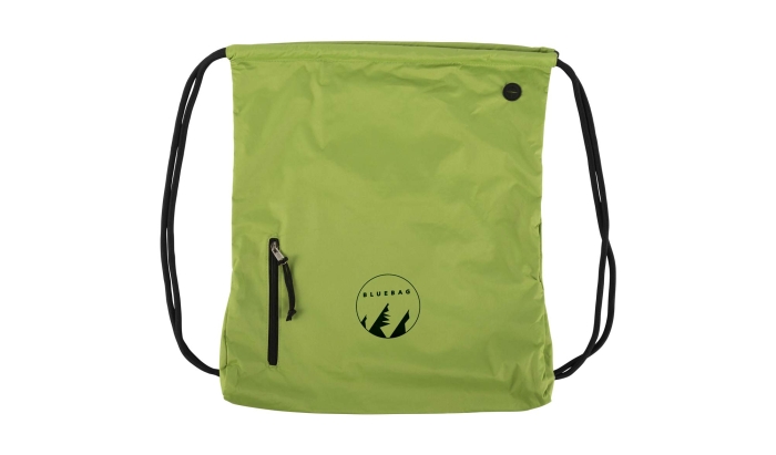 Art. GV0114 Zaino a sacca, chiusura a coulisse. Presenta un vano frontale con chiusura lampo e un foro dove far passare il cavo del powerbank o le cuffiette. Realizzato in pongee 190 T.