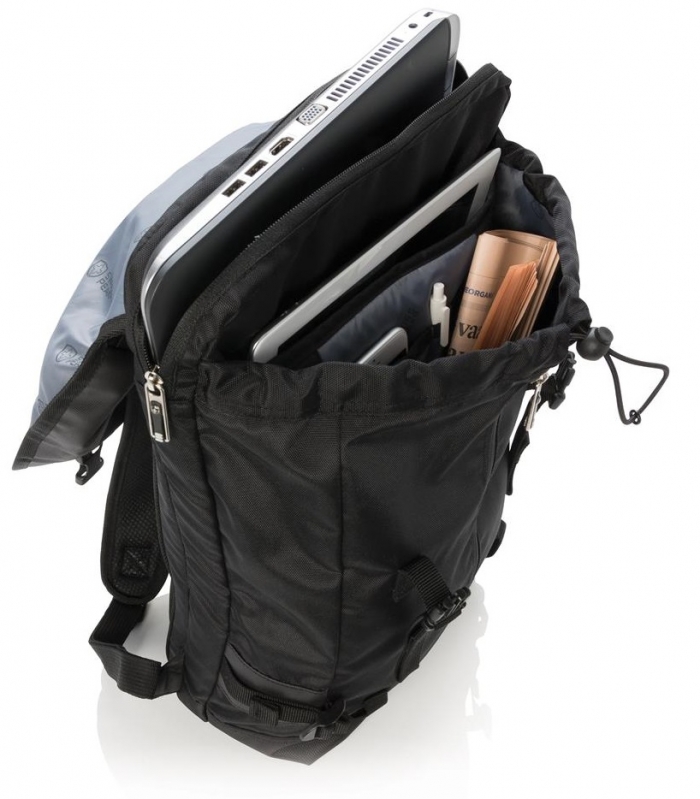 Art. X762-100 Zaino ultraleggero dotato di 2 scomparti principali; 1 con chiusura a strozzo ed 1 a cerniera dove riporre il laptop ed il tablet. Nella parte frontale ha una tasca con chiusura a lampo. Gli spallacci e lo schienale sono imbottiti.