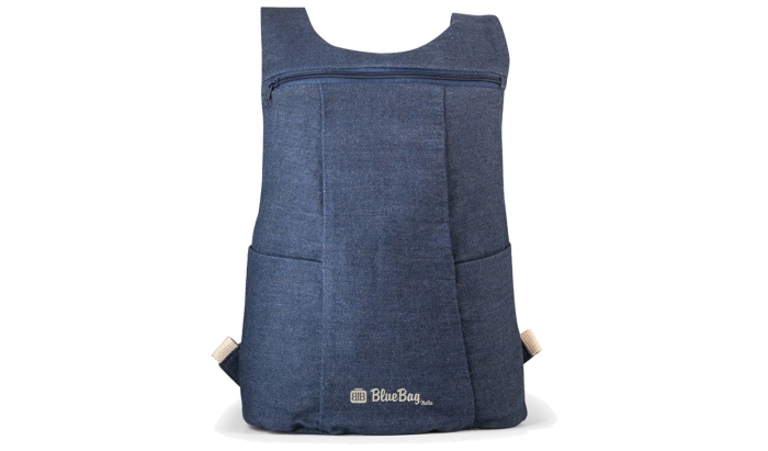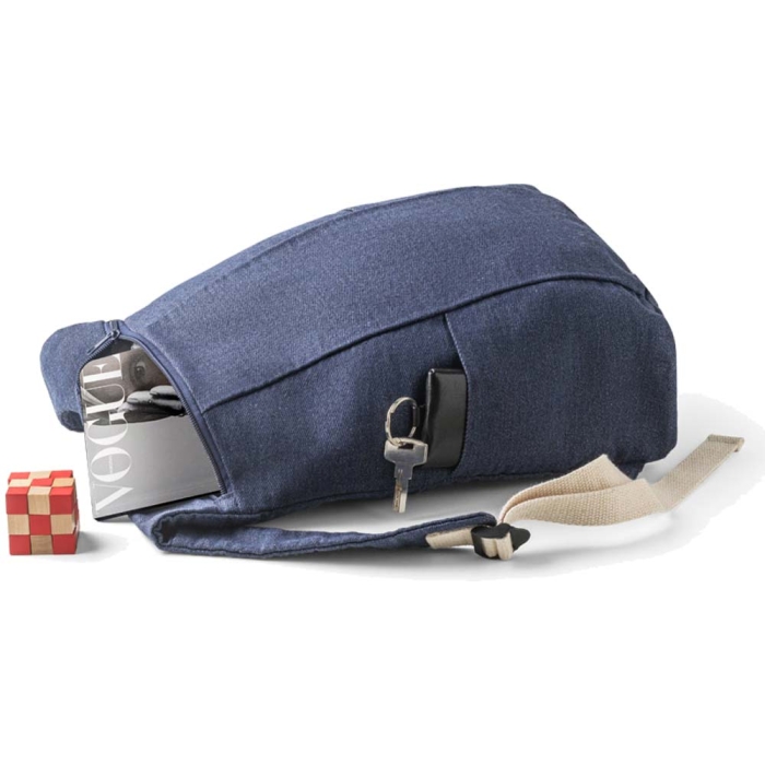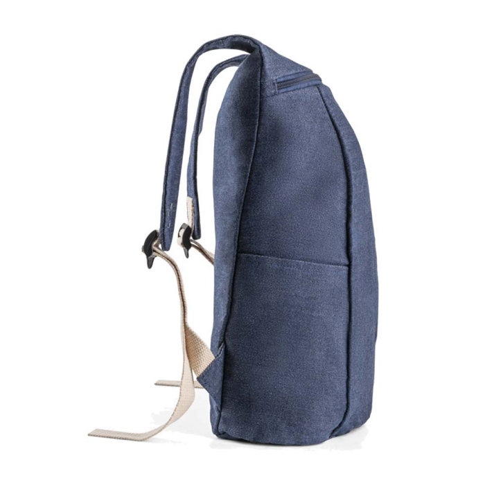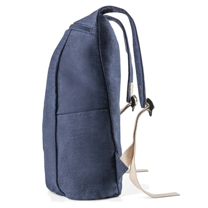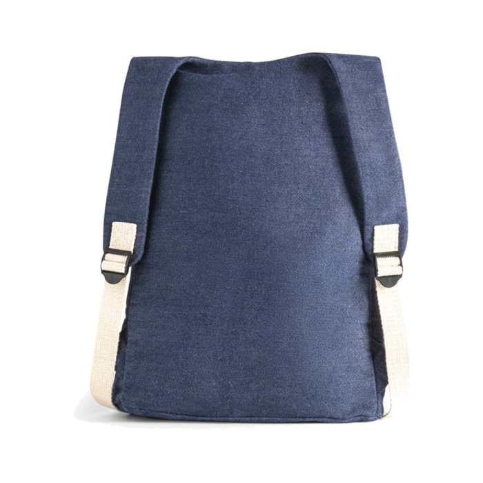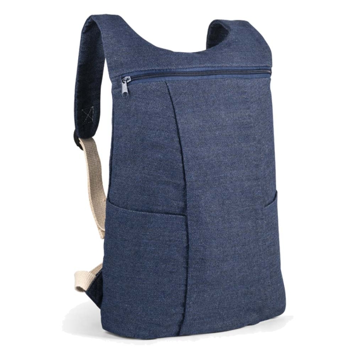 Art. HD03105 Zaino in denim con due tasche frontali e spallacci regolabili. Presenta una fascia in cotone. Cuciture interne rinforzate.