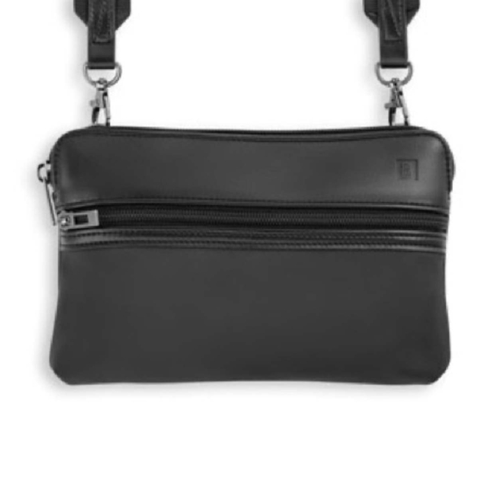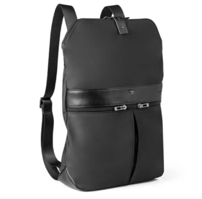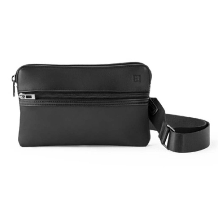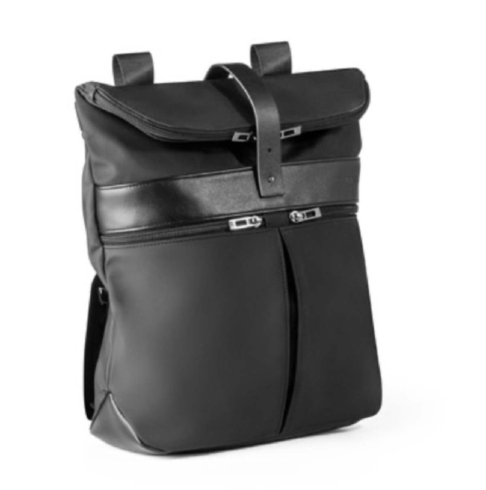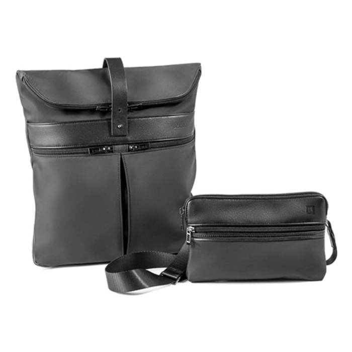 Art. GM03257STR - Zaino elegante nero, questi zaini con logo aziendale contengono una piccola borsa a tracolla in abbinamento che potrai utilizzare anche da sola. Realizzato in microfibra, può essere utilizzato in due modi: con la parte superiore piegata o aperta. Il fondo in similpelle permette di pulirlo facilmente.