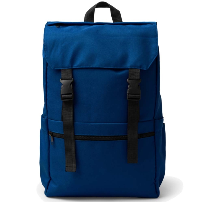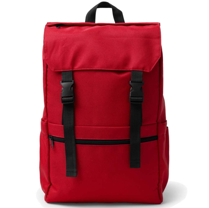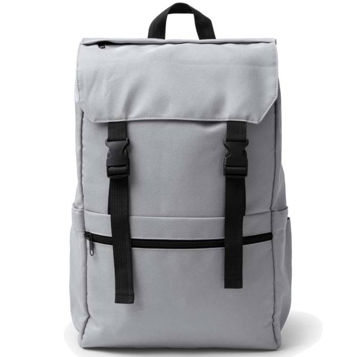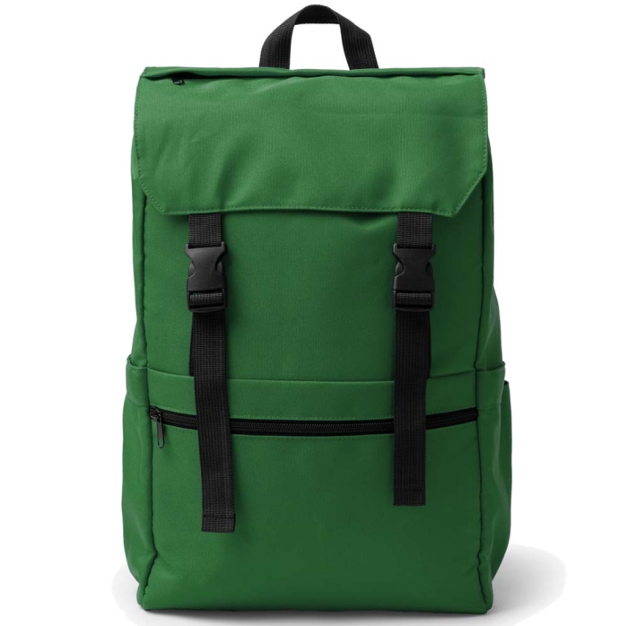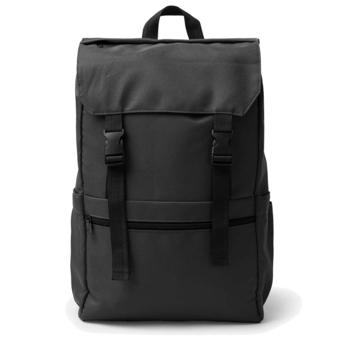 Art. ST2895 Zaino in poliestere RPET 600D. Presenta patta con chiusure regolabili. Scomparto principale con tasca interna per laptop da 15’. Tasche esterne di cui una con chiusura a zip e 2 tasche laterali con elastico. Manici e schienale imbottiti.