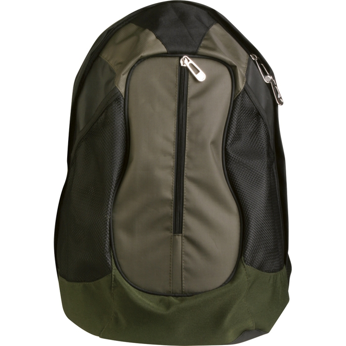 Art. PB35160 Zaino tempo libero trekking in poliestere 600D e ribstop è dotato di un'ampia tasca frontale con chiusura a zip, schienale e spallacci imbottiti, e tasche laterali a rete. È personalizzabile con stampa serigrafica per loghi a tinte piatte o trasferimento termico per loghi in digitale.