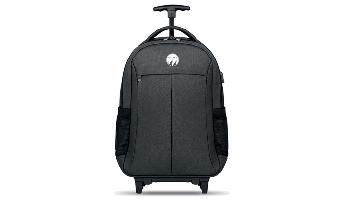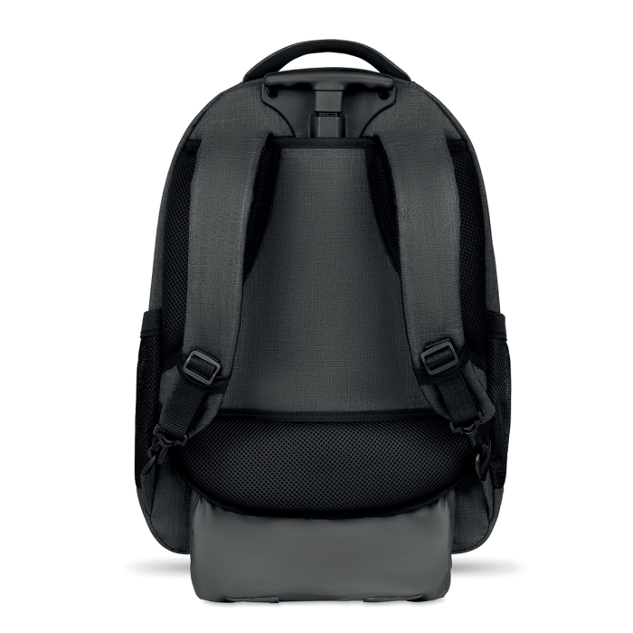 Art. GM0280MO Zaino trolley bicolore in poliestere 360D. Comparto interno per laptop 15’, uno per tablet e tasca frontale con chiusura zip. Schienale e spallacci imbottiti. Tasca protettiva per ruote integrata.