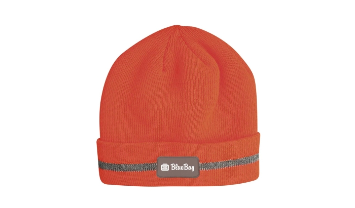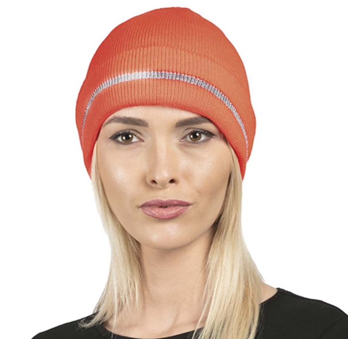 Art. PB29179 Zuccotto acrilico doppio strato sicurezza stradale. Presenta una fascia catarifrangente sul risvolto è realizzato con colori fluorescenti. È personalizzabile con l'applicazione di una targhetta con stampa digitale, offrendo colori vividi e dettagli nitidi.